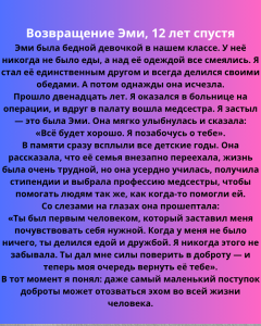 Эми была бедной девочкой в моём классе. У неё никогда не было еды, и все смеялись над её одеждой. Я стал её единственным другом и приносил ей лишние обеды. Потом она исчезла.
