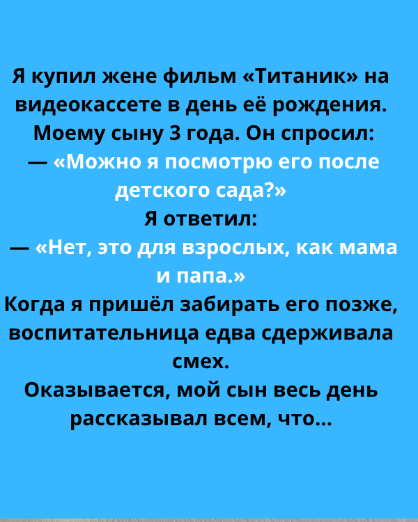 Он думал, что «Титаник» — это игрушка только для взрослых Я купил жене «Титаник» на видео в подарок на день рождения.Наш 3-летний сын спросил:— Можно я посмотрю его после детского
