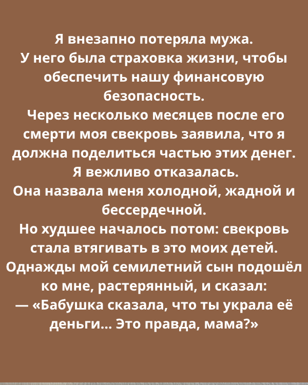 Мои свёкры пытаются забрать страховку мужа — их поступки оставили меня без слов Я внезапно потеряла мужа. Вчера мы были счастливой семьёй — я, он и двое наших замечательных детей.