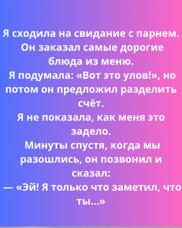 Я думала, что встретила особенного человека, но его следующий звонок всё изменил Я пошла на свидание с парнем. Он заказал самые дорогие блюда из меню. Я подумала: «Вот это улов!»,