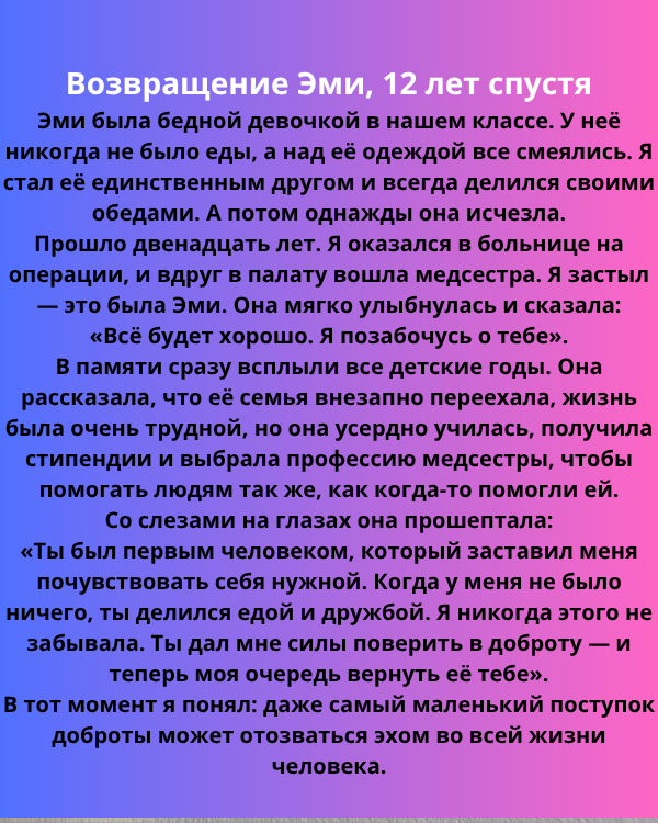 Девочка, которая запомнила Эми была бедной девочкой в моём классе. У неё никогда не было еды, и все смеялись над её одеждой. Я стал её единственным другом и приносил ей