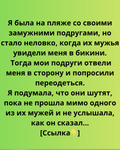 Со временем я заметила, что мои подруги переглядываются, словно что-то обсуждают. Немного позже одна из них осторожно отвела меня в сторону и попросила переодеться во что-то более скромное. Сначала я подумала, что это шутка — ведь мы были на пляже, и все вокруг были в купальниках!