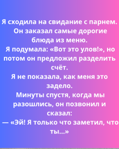 Я пошла на свидание с парнем. Он заказал самые дорогие блюда из меню. Я подумала: «Вот это улов!», но потом он предложил разделить счёт. Я не показала, как меня это задело. Минуты спустя, когда мы разошлись, он позвонил и сказал: