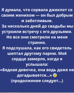 Его друзья всё время смотрели на меня странно — почти с жалостью. Сначала я решила, что это просто нервы перед свадьбой. Но когда я услышала, как его свидетель шепчет другому гостю, моё сердце упало.