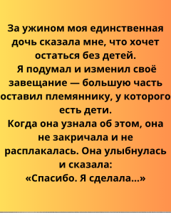 За ужином моя единственная дочь сказала мне, что хочет остаться без детей. Подумав, я изменил своё завещание — большую часть оставил племяннику, у которого есть дети.